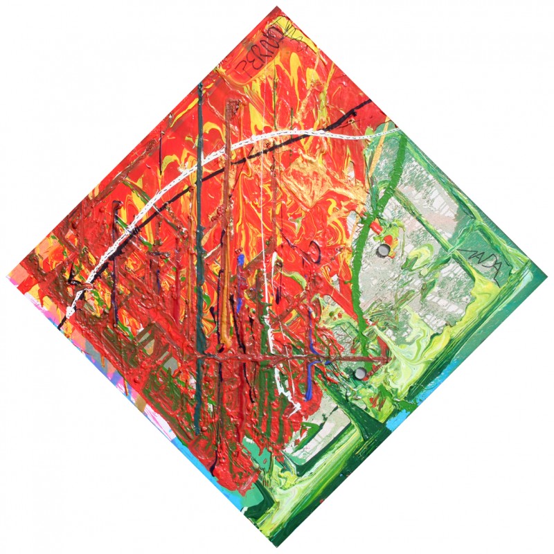 Quite a punk feel to this piece, an inked background with acrylics up front. A gravity flow canvas created while drinking Pernod, I doo like to experiment, a few bottlecaps and some toilet wall tags.