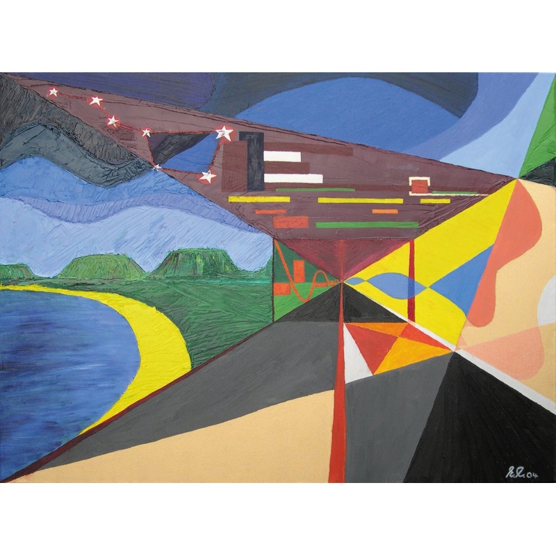 This painting aims to reflect the contrast of experiences that I, the artist was exposed to from a period in my life when I moved from a busy city scene (London) to a rural setting on the west coast of Ireland (Mullaghmore, Co. Sligo). Having used hitch-hiking as a mode of transport for many years, I am aiming to reflect the experience and mood of trying to reach a destination by hitching, my 'minds eye' focusing on the destination with an abstract representation of things I associate with that location.