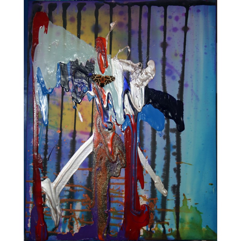 I found a beautifully coloured orange black and white moth lying dead on my window sill and constructed this abstract canvas to mount it on, there is almost a bird like creature, head just above the moth, and just about to consume it.