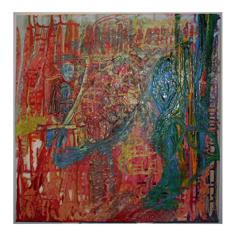 Acrylic, glitter, glue and inks on canvas.