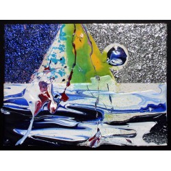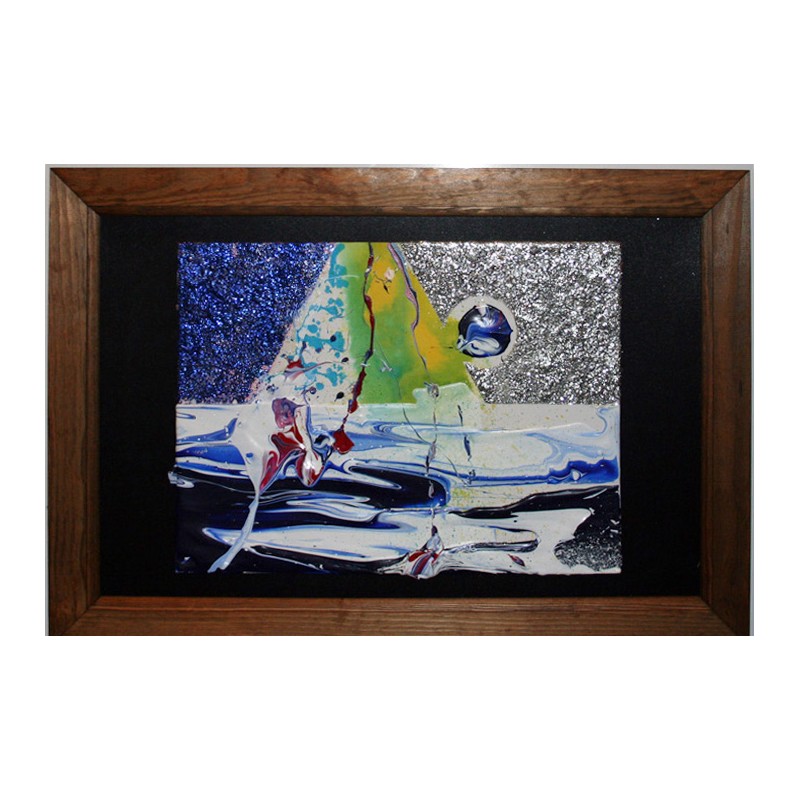 An abstract painting with acrylics, inks and metallic colouring. The painting is on canvas board, the board then mounted on the blackboard frame. I have experimented with metallic finishes here, the reflection depends on your angle and the lighting conditions